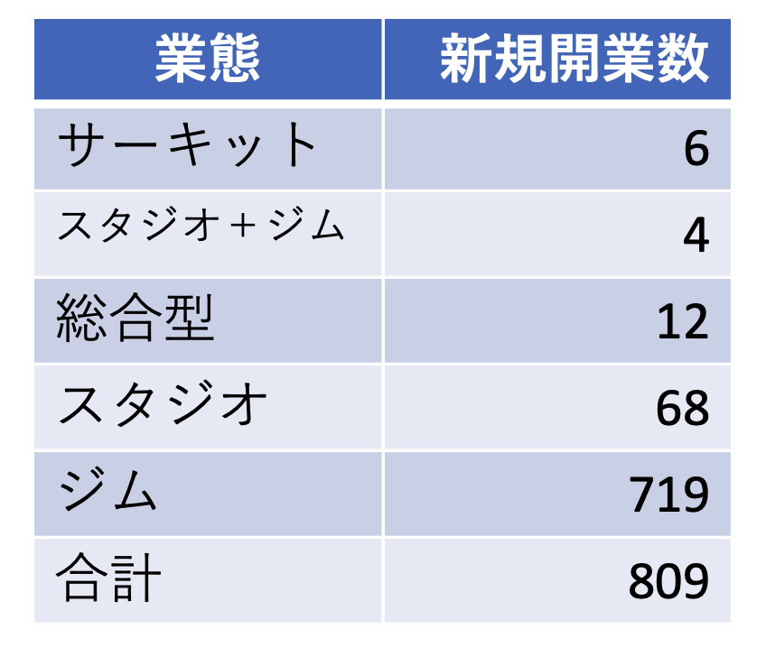 また、同年の新規開設施設数は下表の通り、圧倒的にジム型が多い。